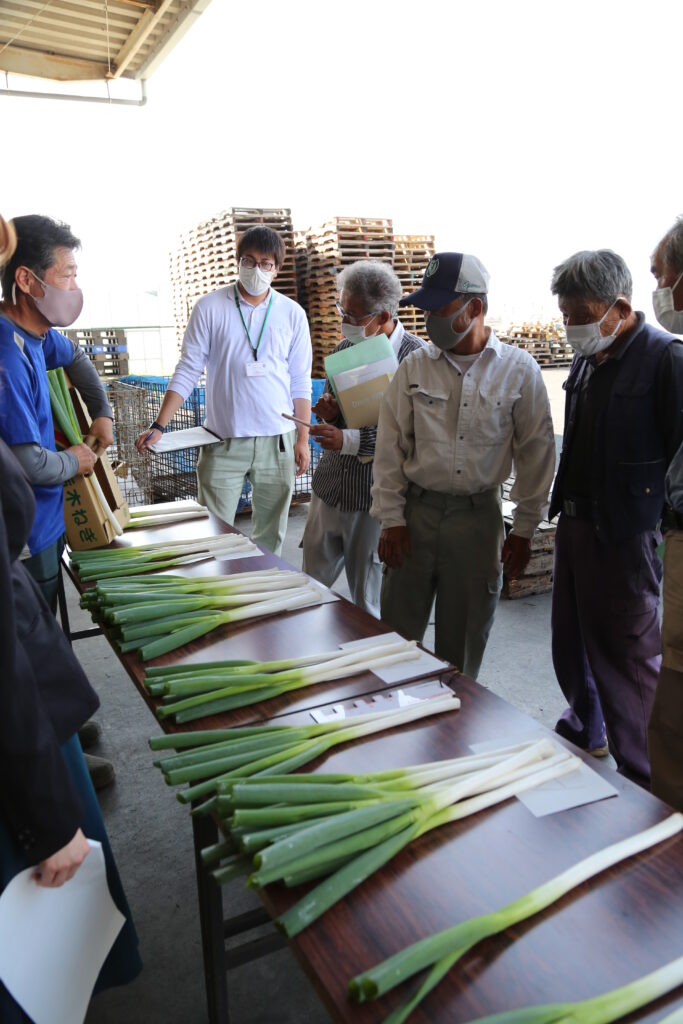 目ぞろえ会では、市場関係者から調製の指導を受け、短箱の出荷では軟白部は25センチ以上とし、葉は最低12センチ残すことや芯を除いて成熟葉を3枚残すことなどを確認しました。