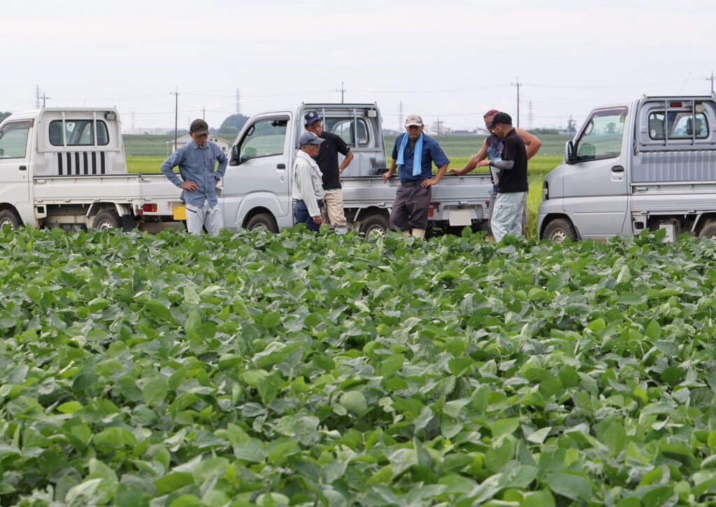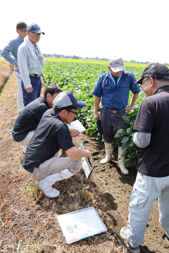 JAおやま生井地区大豆部会は8月20日、生井地区の6カ所の圃場(ほじょう)で大豆「里のほほえみ」の現地検討会を開きました。部会員、関係者ら7人が参加し、栽培管理や生育状況を確認しました。