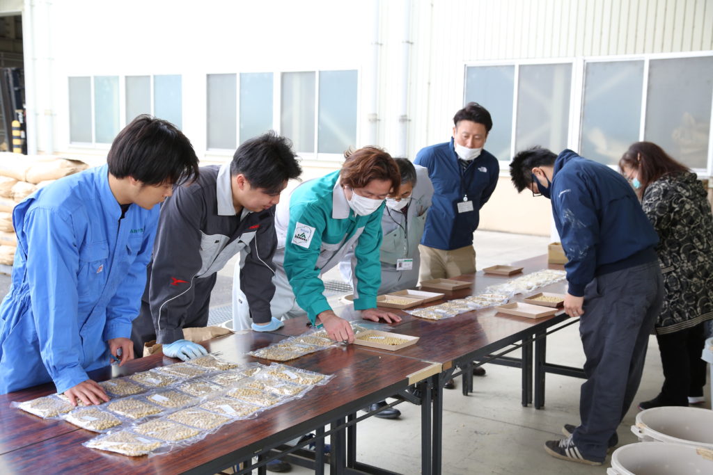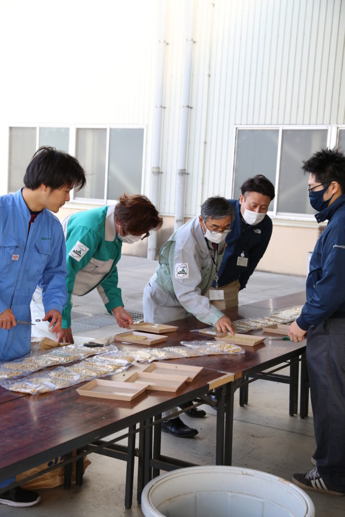 検査員は、乾燥・調整した大豆をカルトンに載せ、粒の状態を基に1等、2等、3等、特定加工用大豆の4段階に格付けしました。JA管内では、101人の生産者が「里のほほえみ」を約183ヘクタール栽培しています。「里のほほえみ」は紫班病やウイルス病に強い他、タンパク質含有率が高く、煮豆や納豆、豆腐などの加工に適正があります。