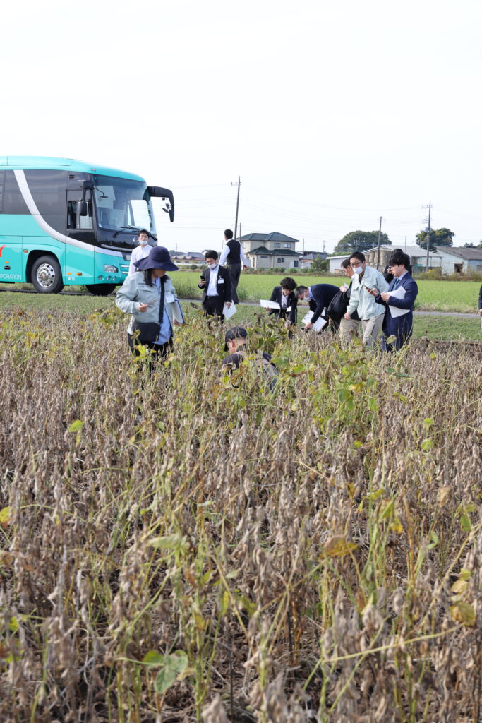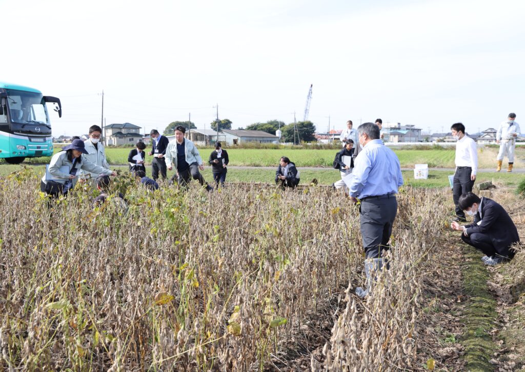 JAおやまは10月31日、大豆実需者の視察を受け入れました。実需者や栃木県下都賀農業振興事務所、JA全農とちぎ、JA担当者らが、小山市の池澤和雄さんの大豆圃場(ほじょう)を視察し、生育状況や収穫時期などを確認しました。