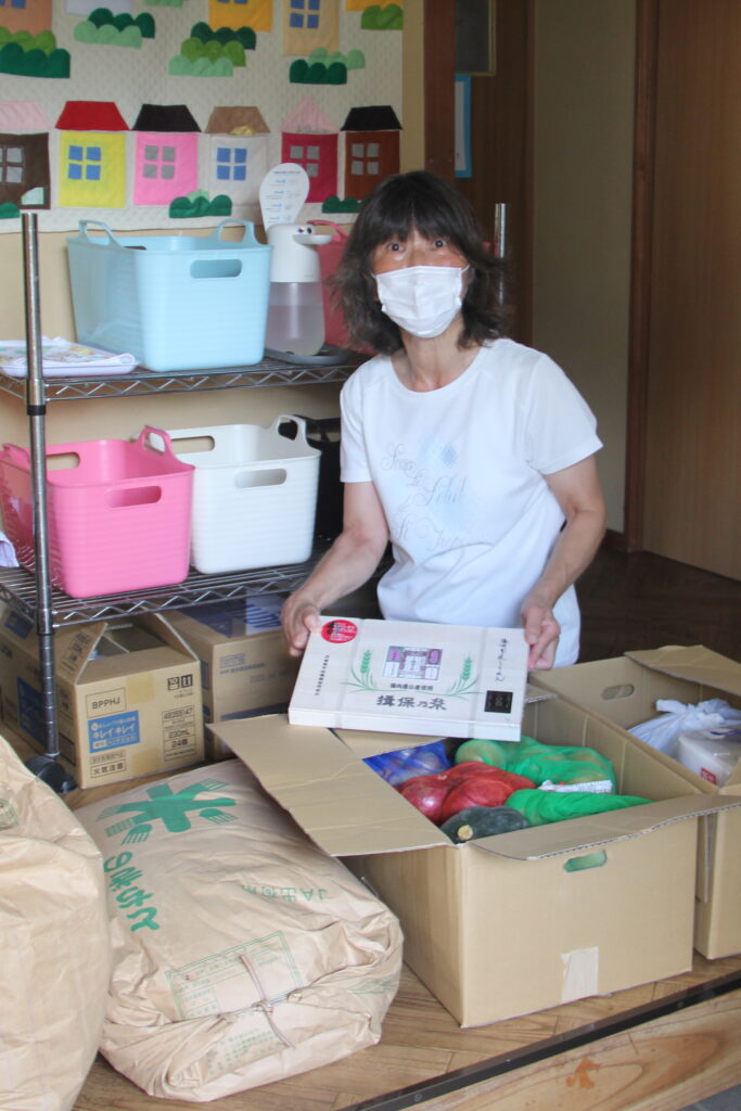 JAおやま女性会がコロナ下で女性会の活動が自粛している中、何か地域に貢献できることはないかと企画しました。今回が初めての提供で、米やタマネギ、ジャガイモ、乾麺などが会員から集まりました。