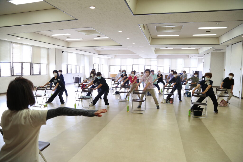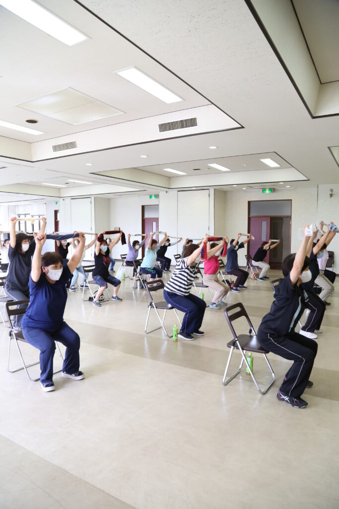 会員は、コロナ下でステイホームが続く中でもできるよう椅子や手拭いを使い、健康な心と体づくりを実践。うちわを使ったゲームも行い、楽しみながら体を動かしました。針谷千枝子支部長は「会員同士で顔を見て安心しながら、楽しく健康も維持できた。このような機会をつくれてよかった」と話しました。
