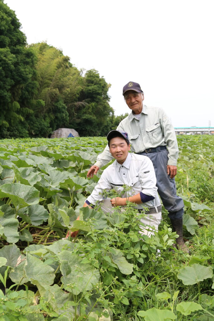 現在の作業は、カボチャの管理・収穫をはじめ、ナスや水稲栽培がメイン。匠さんは「農業は分からないことばかりだったが、知らなかったことが知り、自分の知識になること、さまざまな経験ができることが楽しい」と話します。そんな匠さんを笑顔で見守る一男さんは「農業は毎年、新人の気持ちでやるもの。農業から、たくさん学べる。大変なこともあるが、周りの人・環境に恵まれてきた。人も作物も『愛』が大切。人に教えるにも作物を育てるにも、愛情が重要。愛がなければいいもの、いい環境は作れない」と力説します。「消費者の立場で作物を栽培することで、おのずと高品質の作物ができる。そして、収穫の喜びを味わえる」と話します。