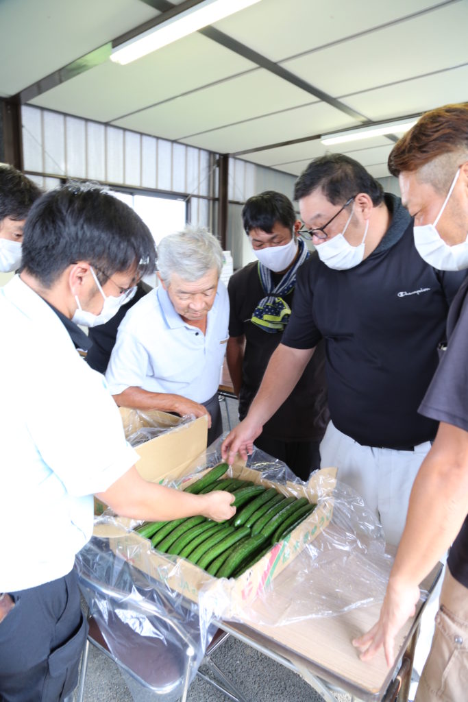 収穫は出荷当日を原則とし、出荷前日の夕方に収穫したものは、コンテナの中にぬれ新聞紙を入れて鮮度を保持し、品質管理に十分注意すること、成り元の切り口は2~5ミリ程度を残し、これ以上長くしないこと、キュウリの表面の汚れは丁寧に拭き取ることなどを申し合わせました。また、両部会は、機械選果での出荷のため、搬入規格の確認を行いました。