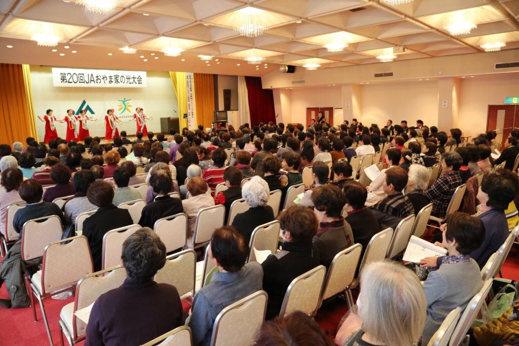 JAおやま女性会は11月下旬、本店で第20回家の光大会を開きました。関係者ら約350人が参加しました。手芸や書道、地産地消料理など各支部の活動発表の場を設け、参加者は一つ一つの作品を丁寧に見て周り、交流を深めました。