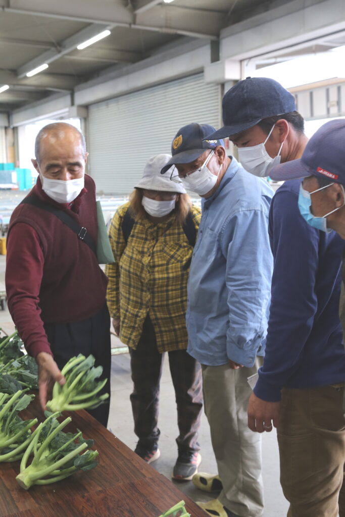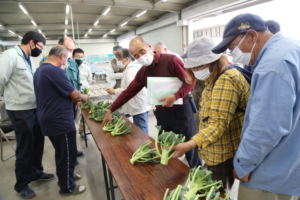目ぞろえ会では、部会員がサンプルのブロッコリーを手に取り、品質や着色などの規格を確認。黄変したもの、花蕾(からい)腐敗などの病害や虫付きなど、賞品価値のないものは出荷しないことなどを申し合わせました。