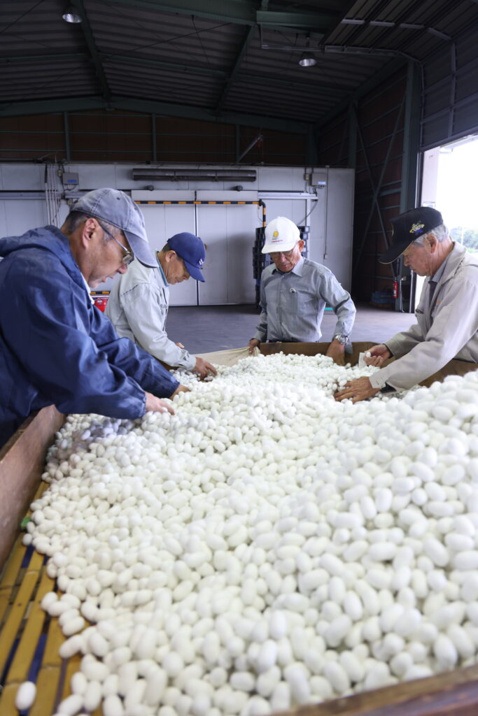 生産者4戸が袋詰めした繭を持ち込み、約583.2キロの繭を選繭台に載せ、汚れ繭や穴あき繭、薄皮繭、玉繭などを手作業で取り除く「選除繭」をしました。選除繭後、群馬県の碓氷製糸に送りました。