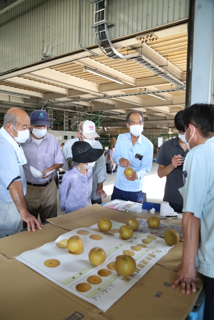 同部会の神保重治部会長は「目ぞろえ会では、色具合を頭に入れ、適熟で収穫し、高品質な『豊水』を部会員一丸となって出荷しよう。そして『新高』『にっこり』へとつなげよう」と話しました。