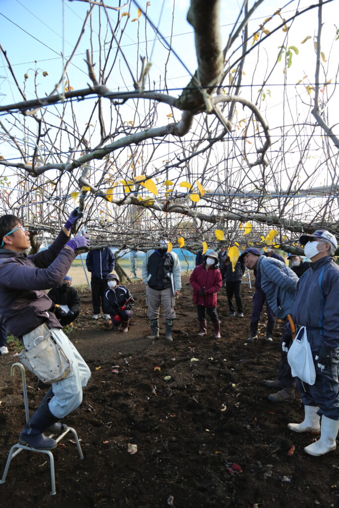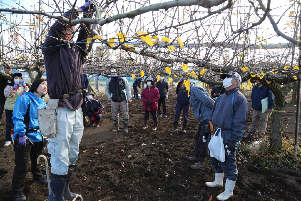 神保重治部会長は「高齢者や女性も簡単にできる枝折り剪定は、着果量も高まる実証がある。各園の環境に向き不向きがあると思うが、講習会を生かし、高品質な梨作りに努めよう」と呼びかけました。