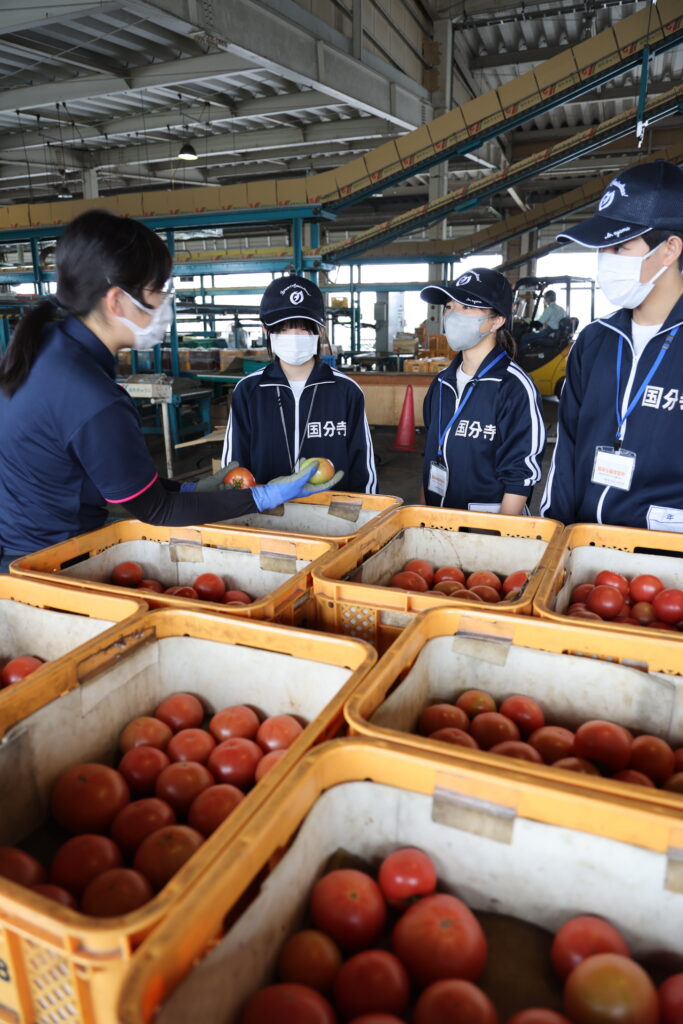 3人はJAの北部集出荷所で青果物の選果を見学後、パック詰めや荷受けを体験。北部営農支援センターで購買業務を、国分寺直売所では商品の品出しや清掃、レジ打ちなどを行い、販売員に取り組みました。