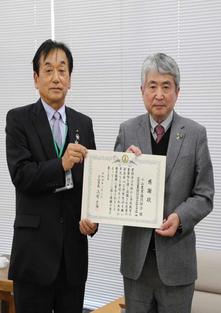 JAの渡邉文雄組合長と共済連栃木の田村登志郎本部長らが市役所を訪れ、浅野正富市長、濱口隆晴教育長らに目録を手渡しました。
