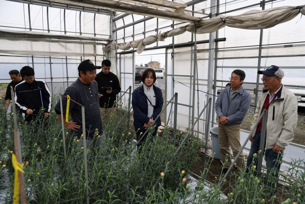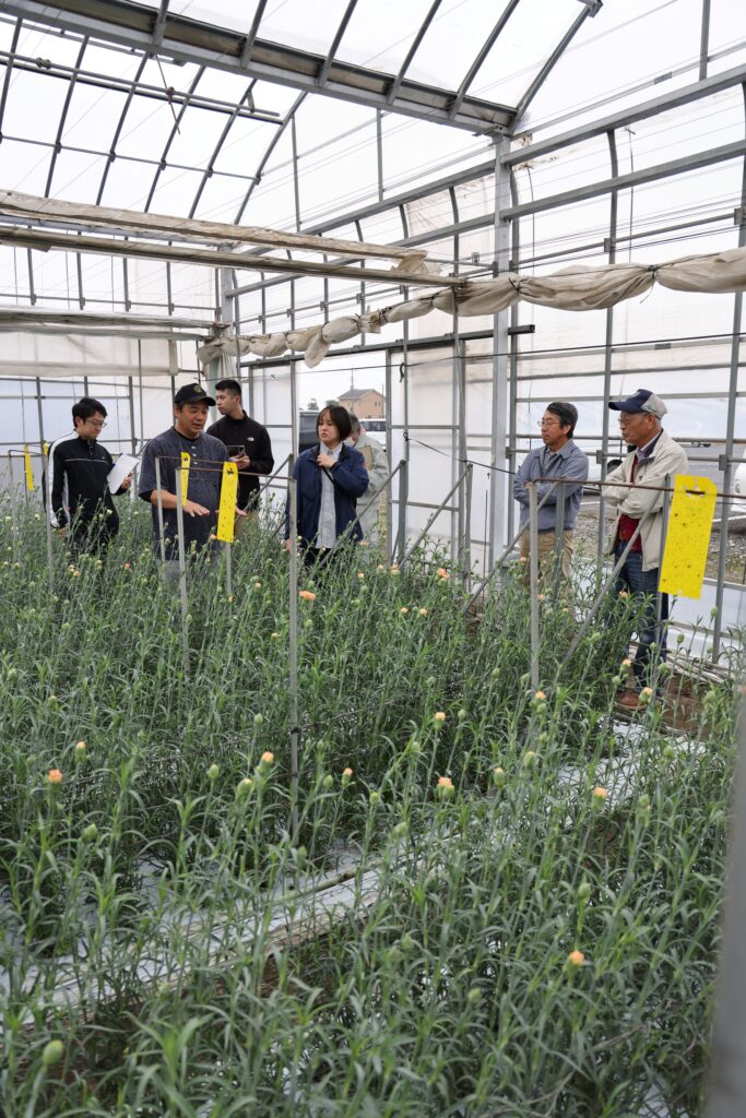 ハウス内で生育状況や開花調整の要点などを確かめ、生産者らは夏場の高温などカーネーションのストレス軽減対策や花切りのタイミングといった他産地の情報も交えながら意見交換しました。