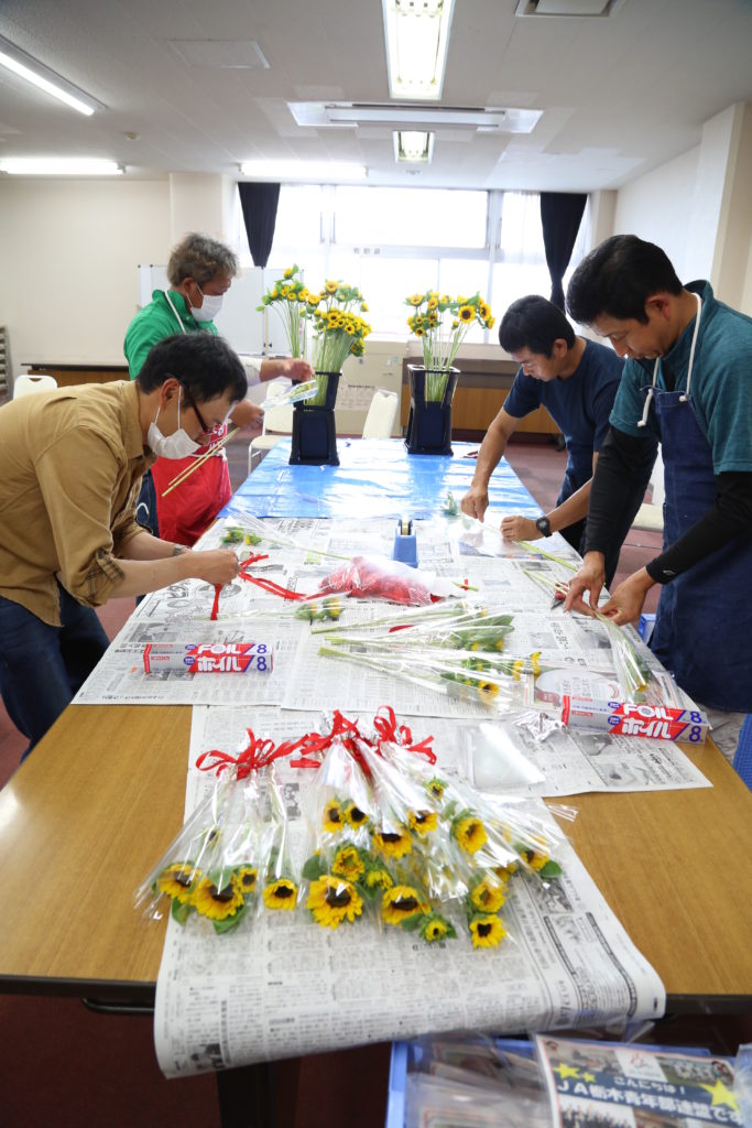 県農協青年部連盟の委員らは、6月25日J、Aおやまの本店で、当日に小山駅で県産農畜産物の消費拡大PRイベントで配る花きのラッピング作業をしました。