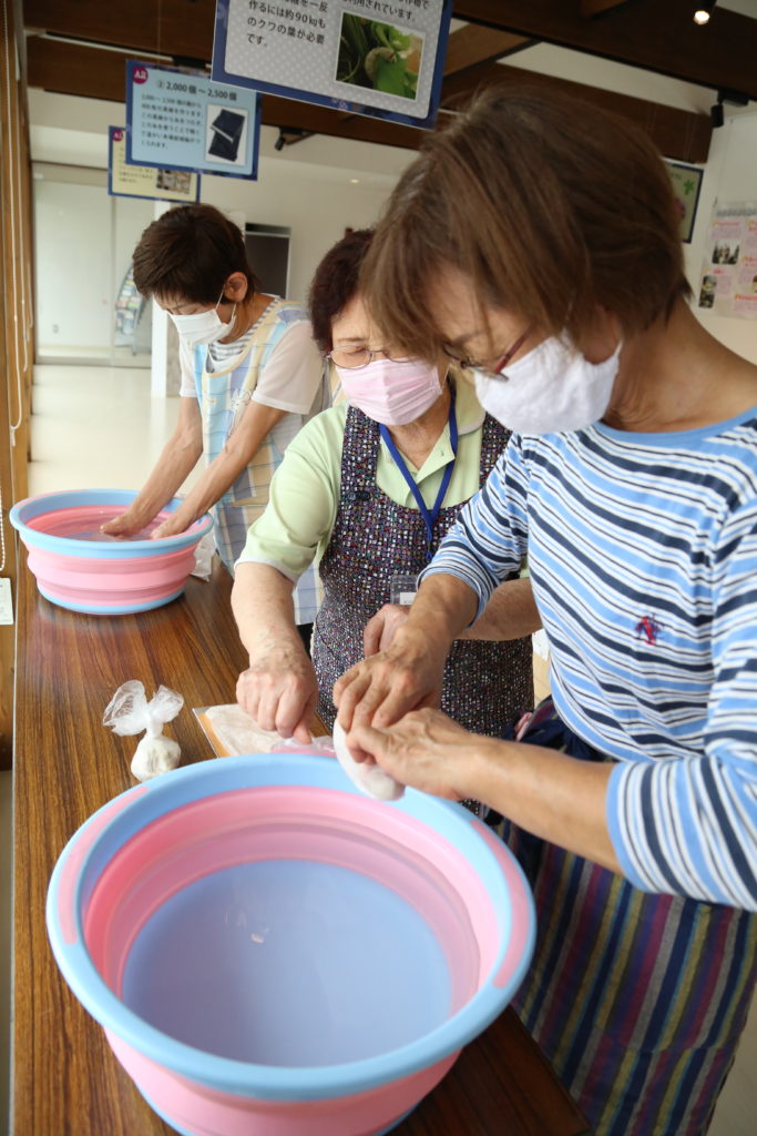 「桑・蚕・繭・真綿かけ・糸つむぎのさと」を会場に、市が誇る伝統産業「本場結城紬」を学ぼうと市内や近隣の県から5名が参加しました。講師に永田順子さん(63)を迎え、真綿かけの手順を丁寧に教わりました。煮て柔らかくした繭をぬるま湯の中で一つずつ指で伸ばし、袋状になったものを幾重にも重ねていきます。体験会で使われた繭は、JAおやま稚蚕飼育所で育てられた繭です。