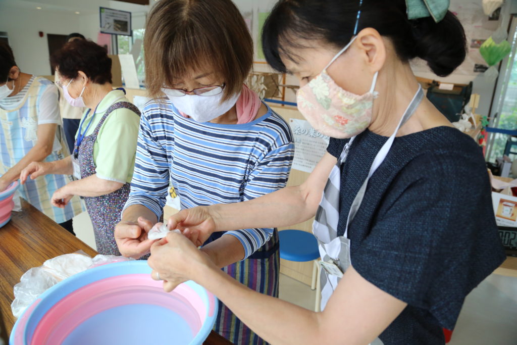 参加者らは「3センチほどの繭をぬるま湯の中で25センチくらいまで満遍なく広げるのは大変。袋真綿が均等であると糸紡ぎの効率がとてもよくなるが、均等にするのが難しい」と話しました。