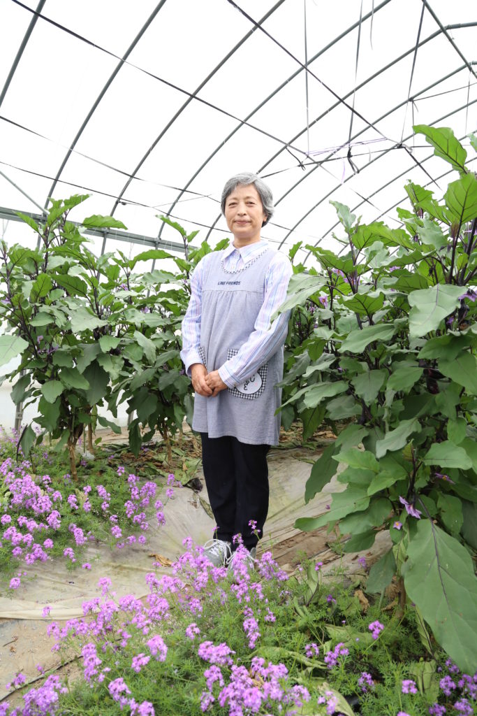 秀子さんが、ナス栽培でポイントとするのは、農薬などを極力使用しない「人と自然」に優しい農業だ。生物農薬、土着天敵栽培を活用しています。ナス栽培に深刻な影響を与えるハダニやアザミウマなどを、バーべラなどの花で集めた、ミヤコカブリダニやスワルスキーカブリダニに退治してもらう害虫管理方法です。自然の力を借りた防除で、化学農薬散布の回数を減らせ、コスト削減、労力削減、景観も美しく、環境にもやさしい「人と自然」に優しい栽培技術です。