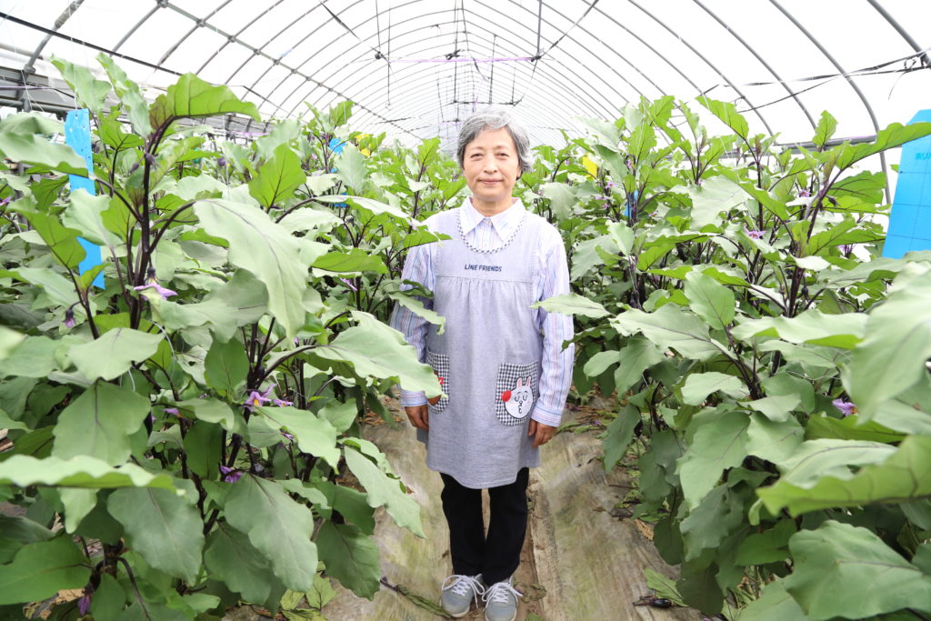 秀子さんの励みは、高品質出荷で収益が上がること。ナスは木が混まないようにし、光の透過率や通気性を向上させ、病害虫防除を行いながら栽培していくことが重要です。太陽の光を与えるために葉かきをし、管理をすること一つ一つのナスの高品質化を目指します。ナスは、色とつやが命。木に力が付くように小まめな手入れを心掛けています。