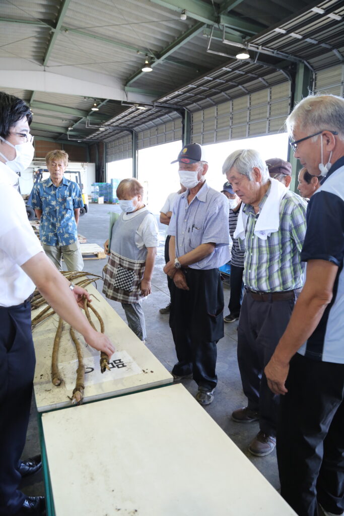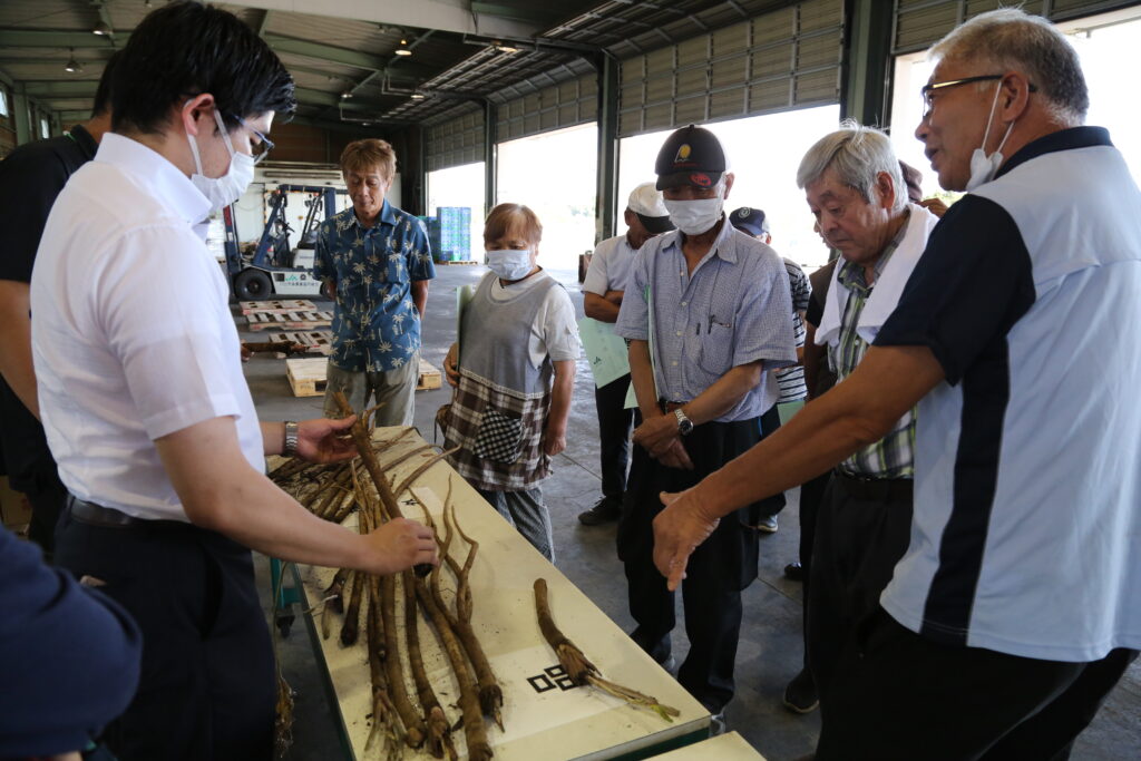 市場関係者が販売情勢などを報告。JAの担当職員が出荷要領や規格、注意点などを説明しました。その後、1本ずつゴボウの等級を検討し、ねじれや長さなどの選別基準を確認しました。