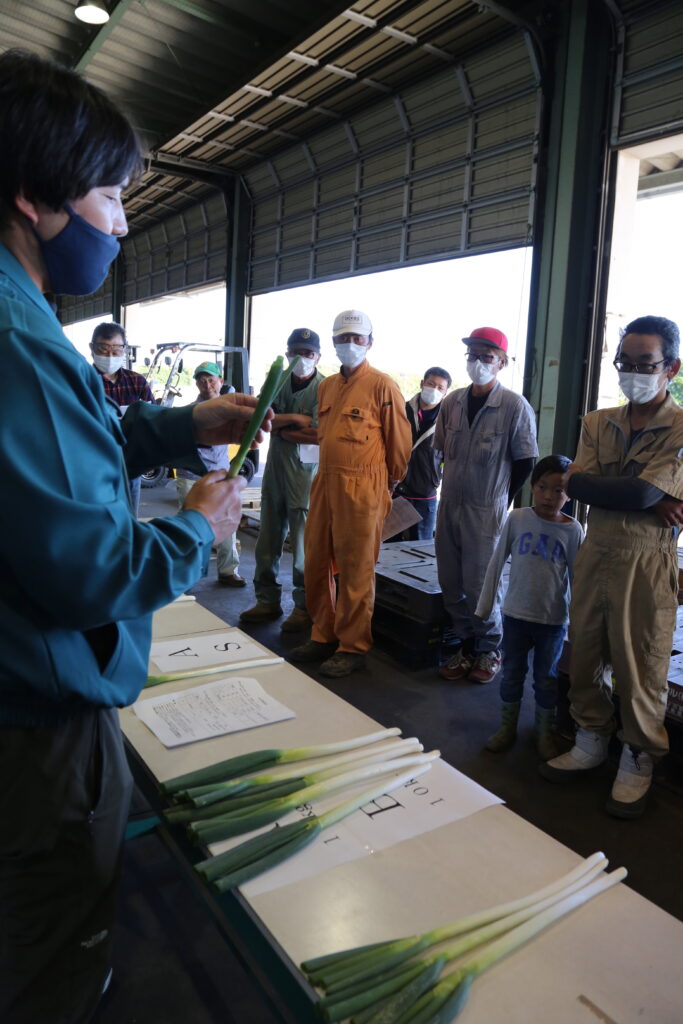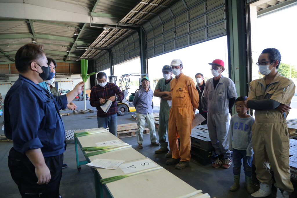 目ぞろえ会では、ALやAMなど、六つの規格ごとに並べられた現物を手に取り、葉曲がりや根の切り方、むき方などを確認し、市場関係者と意見を交換しました。