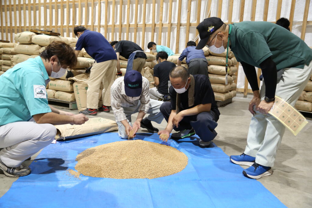 生産者が収穫、乾燥、調製して出荷した小麦を検査員が1袋ずつカルトンに採種して、粒ぞろい、被害粒、水分などを厳正に検査し格付けしました。検査の結果、全量合格となりました。