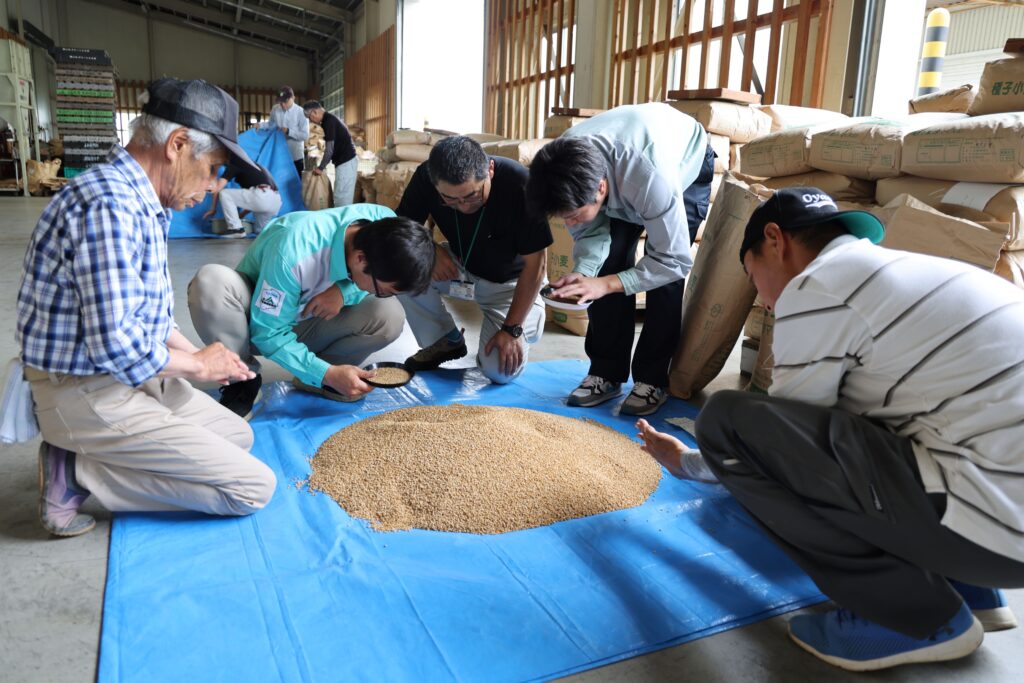 生産者や関係者ら約40人が参加。生産者が収穫、乾燥、調製して出荷して小麦を1袋ずつカルトンに取り、検査員が粒ぞろいや被害粒、水分などを検査して格付けしました。