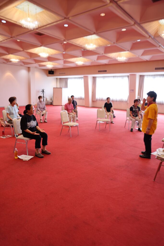 笑いヨガ教室は、笑いヨガティーチャー・ラフターアンバサダー高岩初枝さんを講師に、会員ら15人が参加しました。笑いヨガとは、ヨガの呼吸法と笑いを組み合わせたもの。声を出して笑いながら体を動かすことで身体的・心理的・社会的に効果があるとされています。