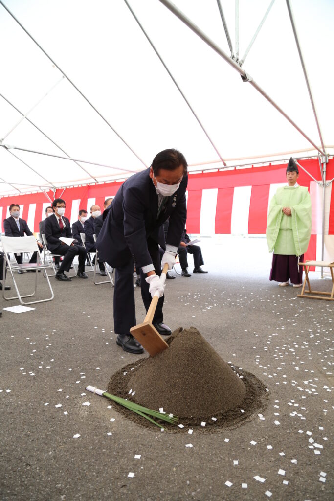 地鎮祭には、JA役職員や工事関係者ら約35人が参加しました。くわ入れの儀をJAの渡邉文雄組合長が行い、関係者が玉串をささげ、これから始まる工事の安全を祈願しました。