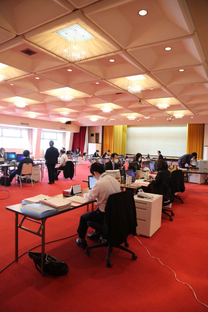 JAでは、本店に貯金や信用、共済をはじめ、経済部、総務課など10部署が同じフロアで業務を行っていました。そのため、職員同士が濃厚接触者となることにより、全体に感染が広がる恐れがあります。各部署の職員を二分化し、臨時スペースとして同JAの会議室を使用。備品や資料などを動かし、コンピューターの電源やプリンターなど環境を整えました。密閉、密集、密接の「3密」を避けるため、職員間でも工夫を凝らし、業務に支障が出ないようにしています。