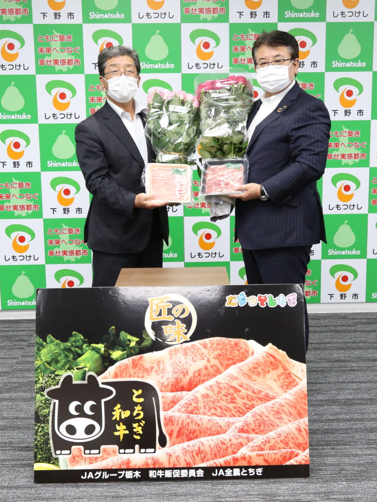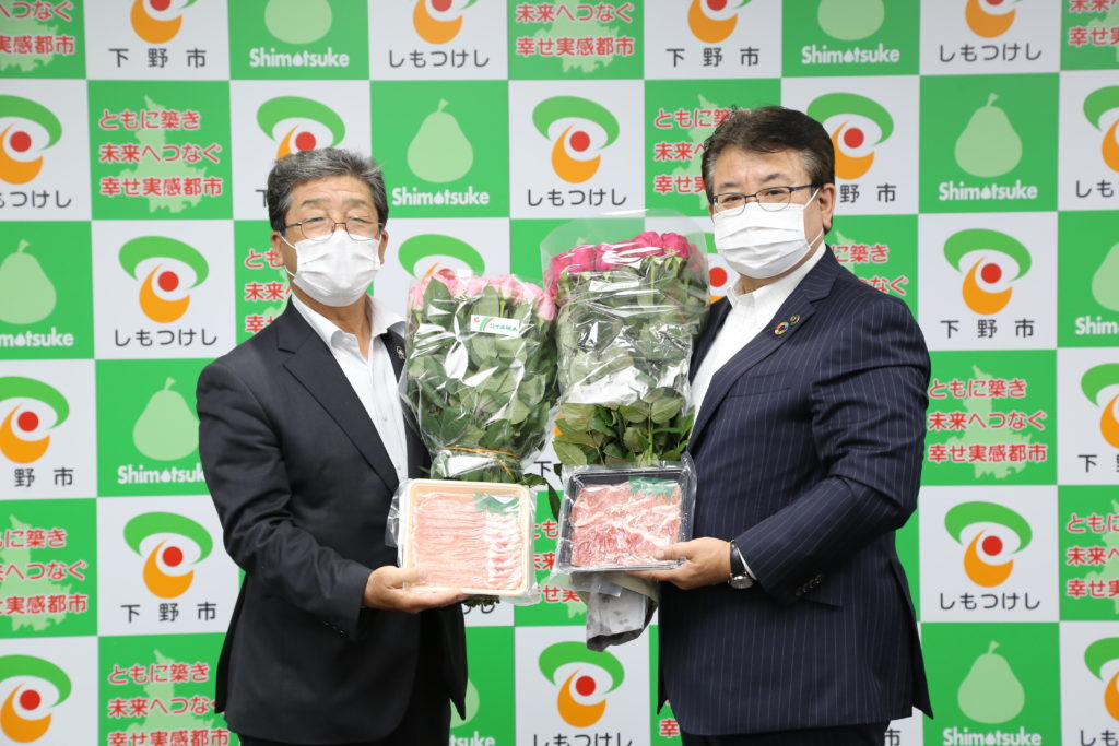 下野市の広瀬寿雄市長は「肉を食べて体力をつけ、免疫力をつけよう。花は、福祉関係に励ましになればと職員間で相談をし、介護関係者の下に渡すことになった。花があると華やかになる。少しでも支援ができれば協力したい」と話しました。JAおやま福田浩一郎組合長は「少しでも多くの方に購入していただけることは非常にありがたいことだ」と感謝を述べました。