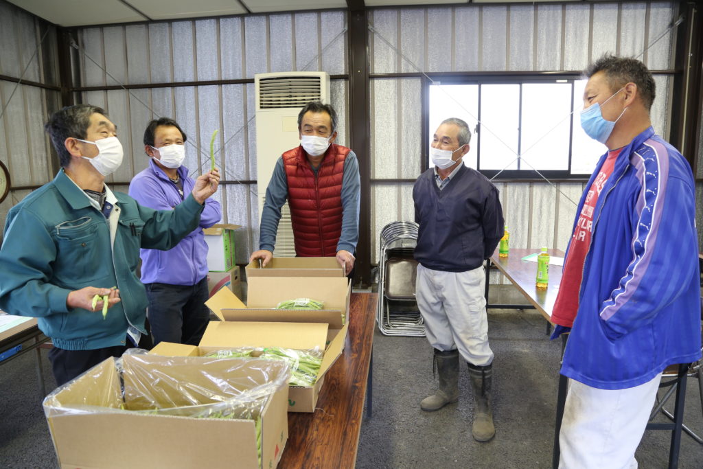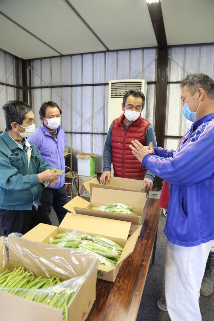 今年は夏場の高温により、生育遅れが懸念されていましたが、台風の被害もなく順調に生育しています。参加者は、曲がりやこぶ、傷など調整、選別することや、花は完全に除去することなどを申し合わせた。長さをそろえて袋詰めすること、段ボール箱への詰め方なども再確認。「出荷段ボール箱の上の両端をテープで止め、荷姿を統一すること」と周知しました。生産者代表の星野浩行さんは「栽培管理に十分に注意し、高品質なインゲンの出荷に努めよう」と呼び掛けました。