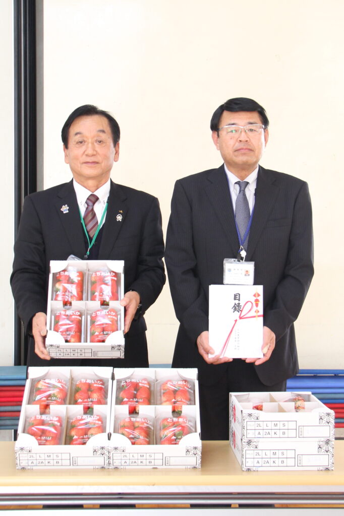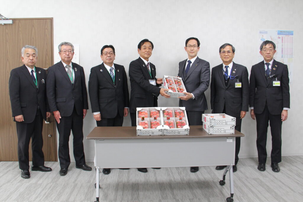 1月17日にJAの渡邉文雄組合長らが県立国分寺特別支援学校と下野市役所を訪れ、五味田寿校長と坂村哲也市長に目録と「とちあいか」を贈りました。