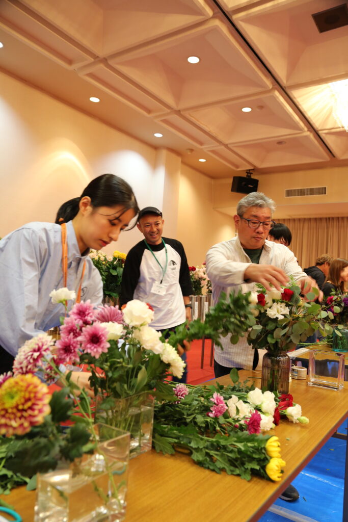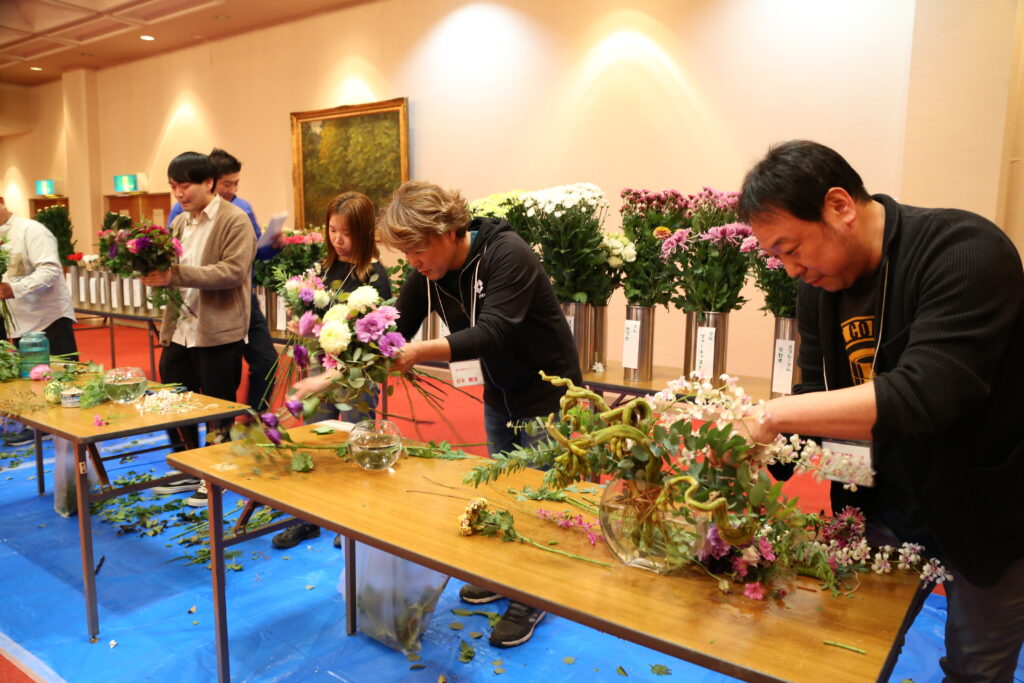 各市場の買参人代表者12人が、小山市のJA本店で、花を使ったフラワーアレンジメントを実演しました。生産者は、栽培した花々が美しく生けられる様子に感動していました。買参人は「花がとても良いため、素材を生かすように生けた」「素材の良さを360度から分かるようにした」など話しました。