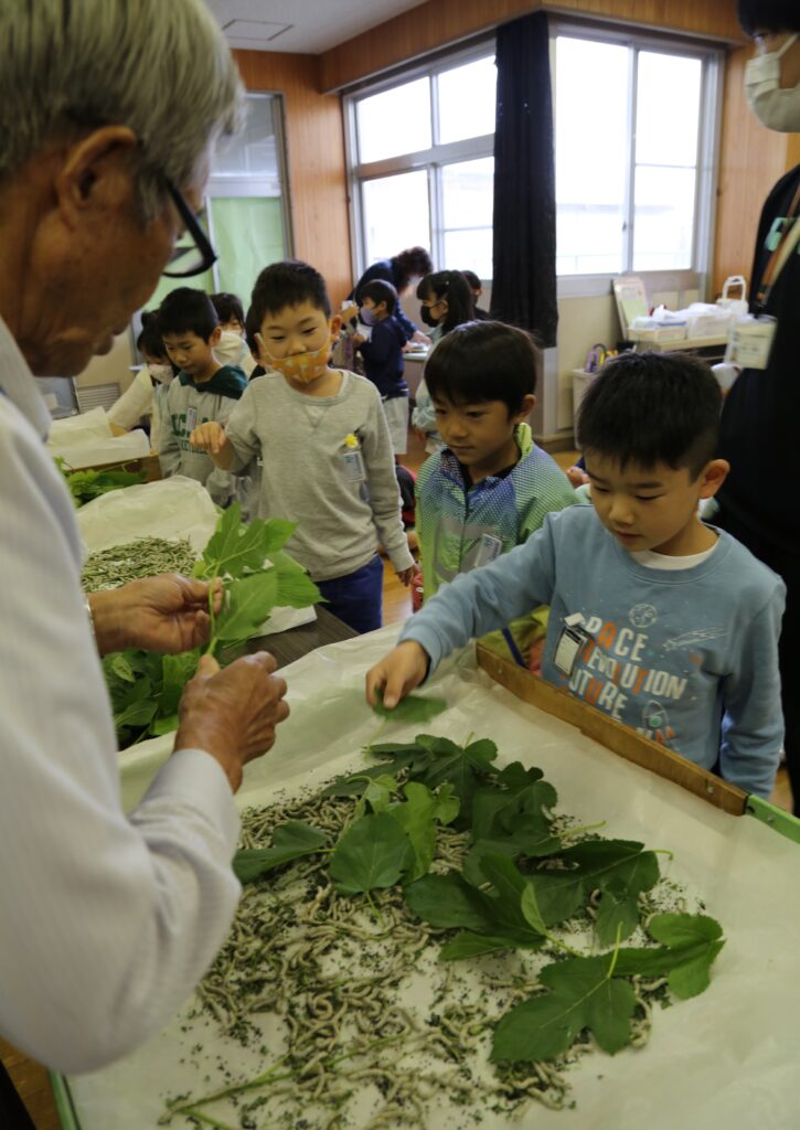 廊下に設けた木製の蚕室で温度や湿度を管理し、野沢さんの指導で2年生を中心に桑の葉を与え、成長を見守ります。児童は体長約2センチの蚕を熱心に観察し「元気に育つよう、お世話を頑張る」と話しました。