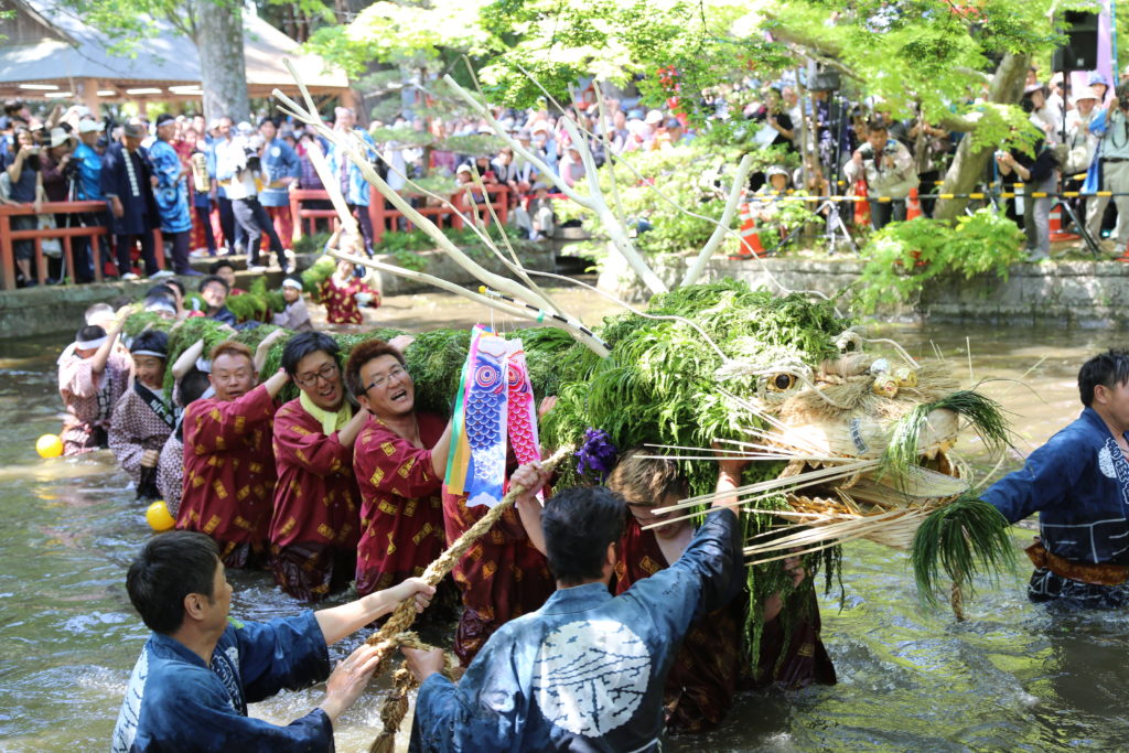 蛇は、一体の長さ15メートル以上、重さ350キロほどにもなります。おはらいを受けた後、本殿を1周し、境内にある弁天池で「水呑(の)みの儀」を行いました。担ぎ手による「ジャーガマイタ、ジャガマイタ」との掛け声とともに池の中に入ります。激しい水しぶきを上げる姿に、見物客から大きな声援と拍手が起こりました。