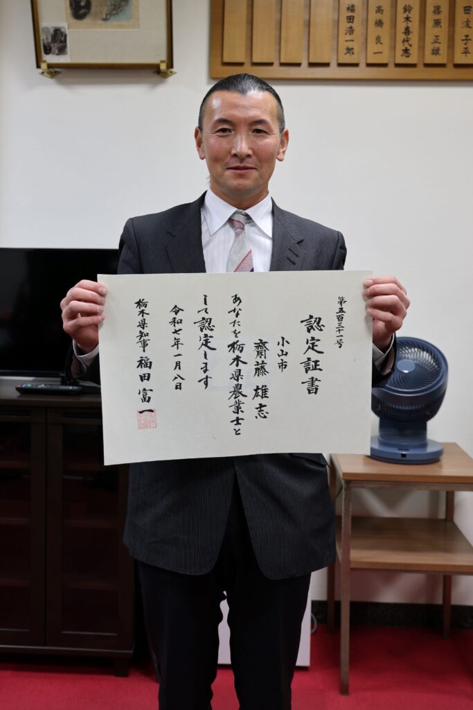 齋藤さんは「農業士に選ばれたことを励みに農業・地域の発展に努めたい。近年の飼養戸数の減少や高齢化に伴い、生産・経営基盤の弱体化や耕作放棄地など懸念している。培ってきた技術を生かし、農業・地域の発展を図っていきたい」と意欲を語りました。