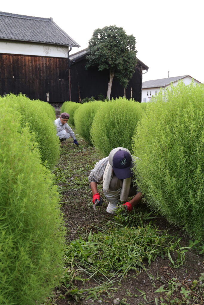 コキアは風に弱いため、定植後1メートルほどに成長したところで1本ずつ鉄の支柱を立てます。1.4メートルほどで竹も添えて結び、風邪への備えを強化します。コキアは根が横に成長することから、根と回りに生える雑草を絡ませて定着させます。このため雑草は抜かず、手作業で定期的に取り除くようにしています。