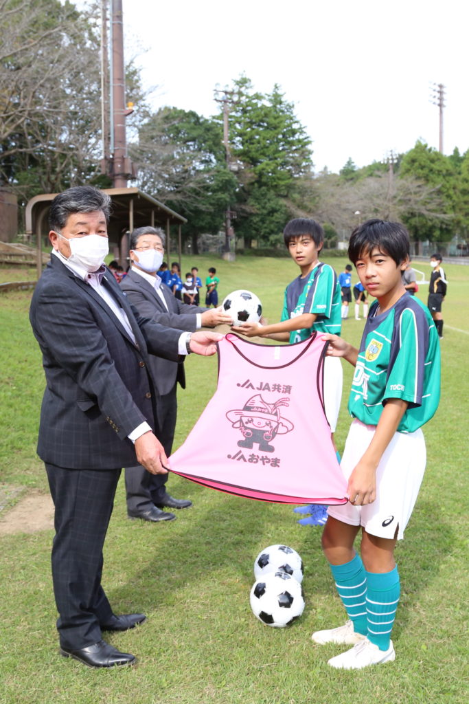 同JAは各出場チームにJAおやま・JA共済のロゴ、JAおやまオリジナルイメージキャラクターおやまるくんがあしらわれたオリジナルビブス100着とJAおやまネーム入りのサッカーボール10個を贈呈しました。