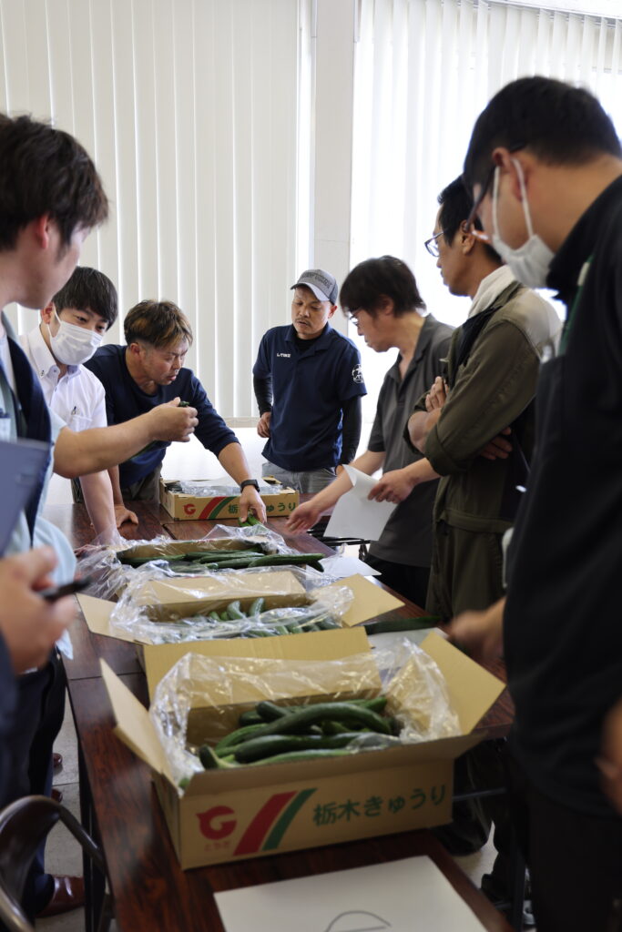 JAおやま南部・北部きゅうり部会は6月4日、東部集出荷所と北部集出荷所で2024年産露地キュウリの目ぞろえ会を開きました。部会、市場の関係者ら約30人が参加。出荷最盛に備え、規格や要領などを確認しました。