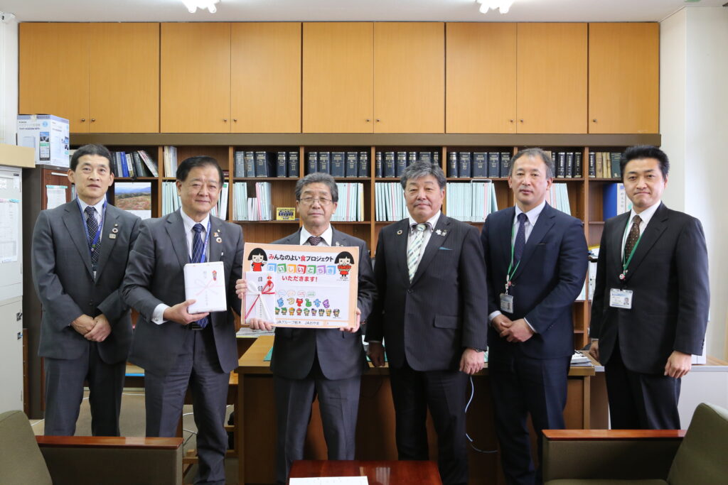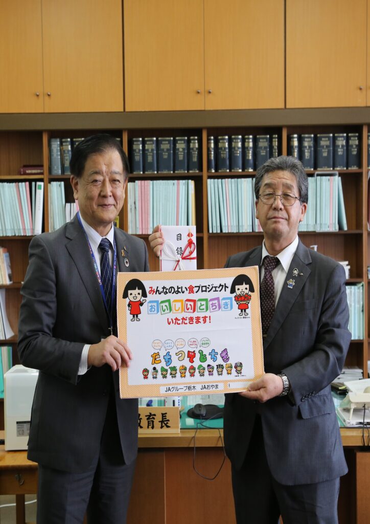 JAの福田浩一郎組合長をはじめ、酒井吉一専務、岸均部長、菅沼英明営農企画課長は3月25日、小山市の濱口隆晴教育長を訪ね、13万8,500円分の図書カードを贈りました。「食育」「地産地消」の取り組みの一環で2010年から取り組んでおり、今年で11回目となります。