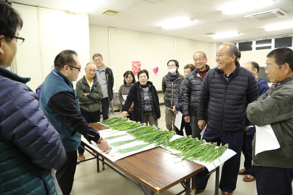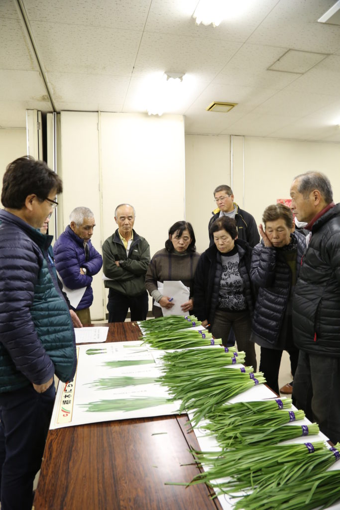 部会員が持ち寄ったニラを使って、葉の長さや幅などの規格を確認。市場関係者が等級の付け方、選別の仕方などを説明しました。