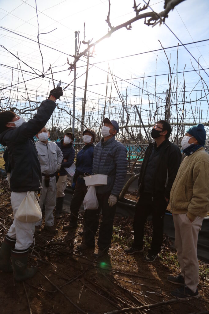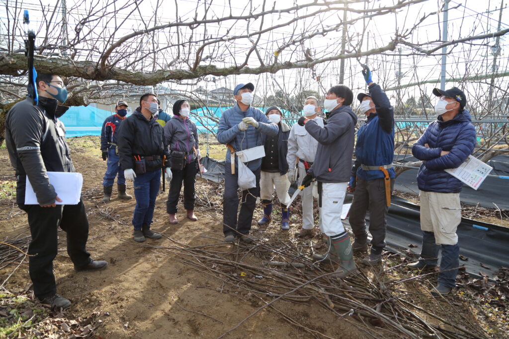 山中技師は①短果枝の取り扱い②発芽の整理③側枝の配置②骨格枝の管理―などを説明しました。また、みつ症が発生しやすい「豊水」の老木樹などを中心に改植するように注意を呼びかけました。