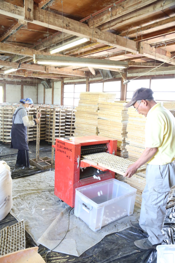 五十畑部会長は、春蚕を約25万頭飼育し、繭の出荷は年4回(春蚕I、春蚕Ⅱ、晩秋I、晩秋Ⅱ)行っています。稚蚕は、体が小さく弱いため、滅菌された環境の飼育室で稚蚕人工飼料を与えて育てられます。蚕は、ふ化してから繭になるまで4回脱皮し、3齢(生まれてから約11日目)に育った時点で養蚕農家に配られます。蚕は、養蚕農家に配蚕後、約15日で約8センチの大きさになります。繭を作る時期を迎えると、風通しの良い高い場所に設置した回転蔟(=均等に繭を作るように回転させる格子状の木枠)の中で、約3、4日間かけて蚕は繭を作られます。
