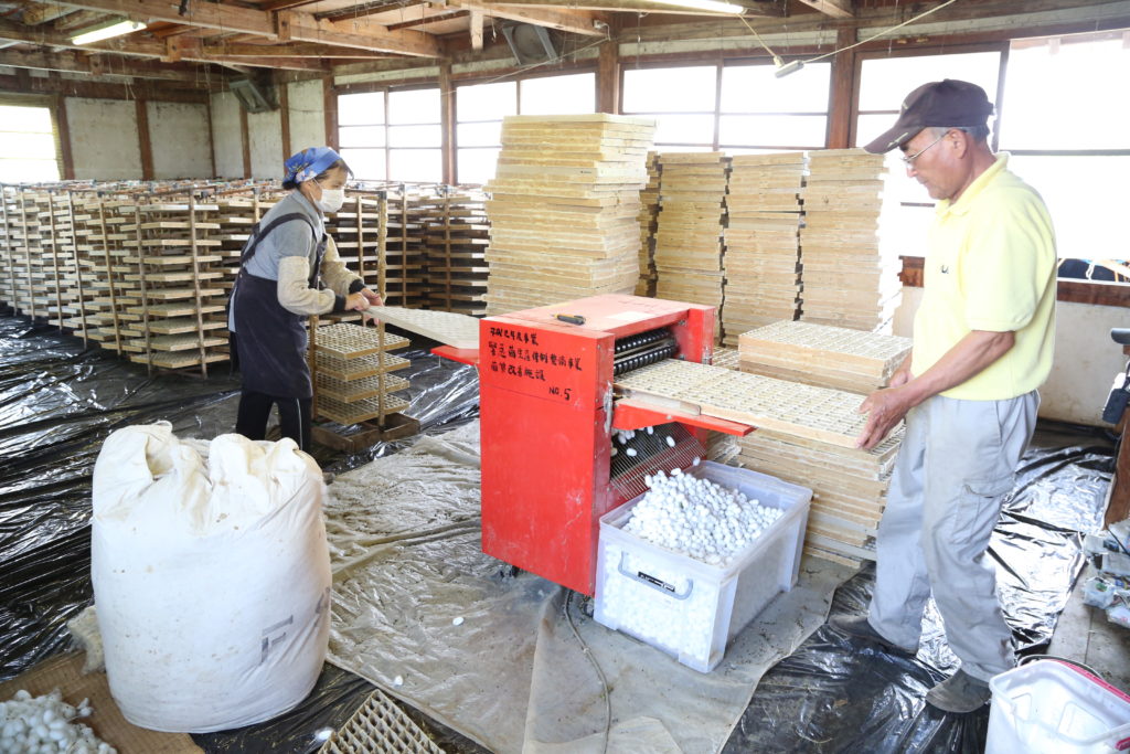 出荷に向けてする「回転蔟(かいてんぞく)」から繭を外す作業をするJAおやま養蚕部会の部会長五十畑(いかはた)茂(72)さんと妻、啓子さん(69)。