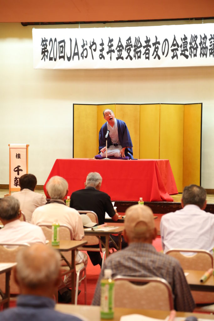 総会後、高齢者向けの交通安全教室を行いました。会員の意識向上を図りました。記念講演では、落語家の桂千朝さんを招き、交通安全をテーマにした落語を楽しみました。