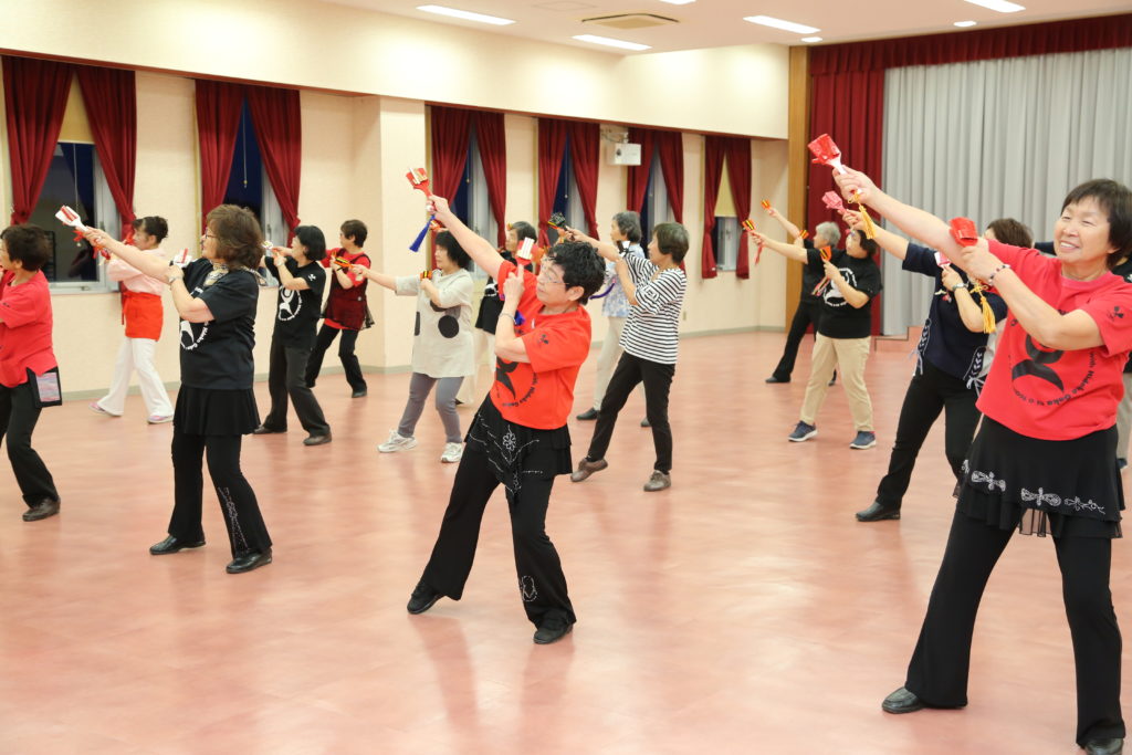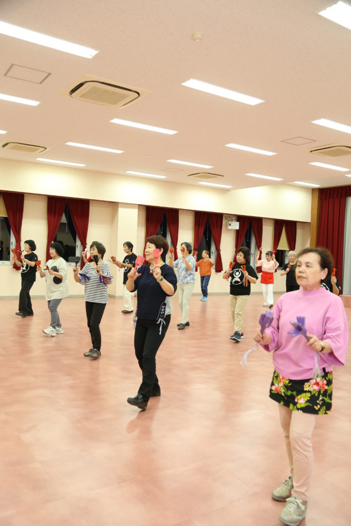 「おやまサマーフェスティバル2019」に参加する大谷、間々田、豊田、桑、国分寺の5支部の会員らは、両手に鳴子を持ち、曲に合わせながら、元気よく練習しました。本番に披露する「笑って人生125歳」の曲は、みんなで楽しく笑って元気に長生きしようという思いが込められています。手の角度、顔の上げ方など先生のアドバイスを受けながら、練習を繰り返しました。観客の心に響く踊りを目指し、本番を迎えます。