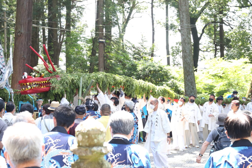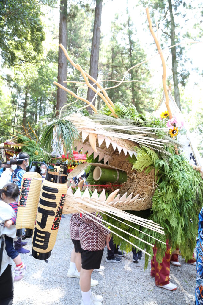 蛇体は、地区の子どもからお年寄りまで総動員で個性あふれる7体を竹、わら、シダなどで作成。蛇は、一体の長さ15メートル以上、重さ350キロほどにもなります。おはらいを受けた後、本殿を1周し、「八大龍王」ののぼりを先頭に、小・中学生が大人のサポートを受けながら「ジャーガマイタ、ジャガマイタ」の元気なかけ声とともに担ぎ、境内を出て周辺地域を練り歩きます。
