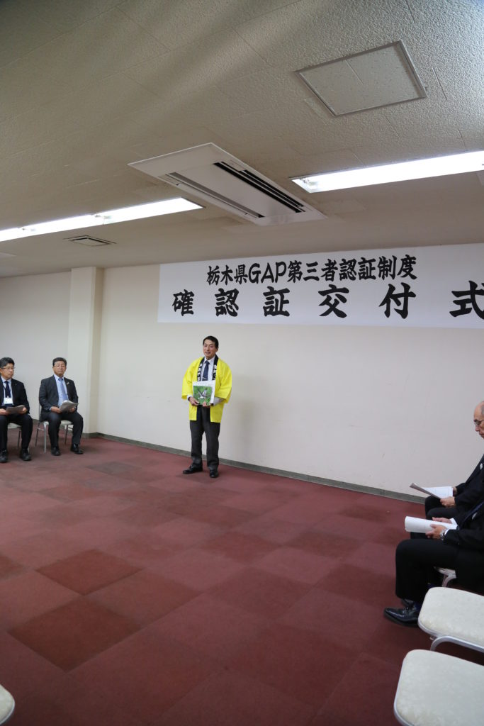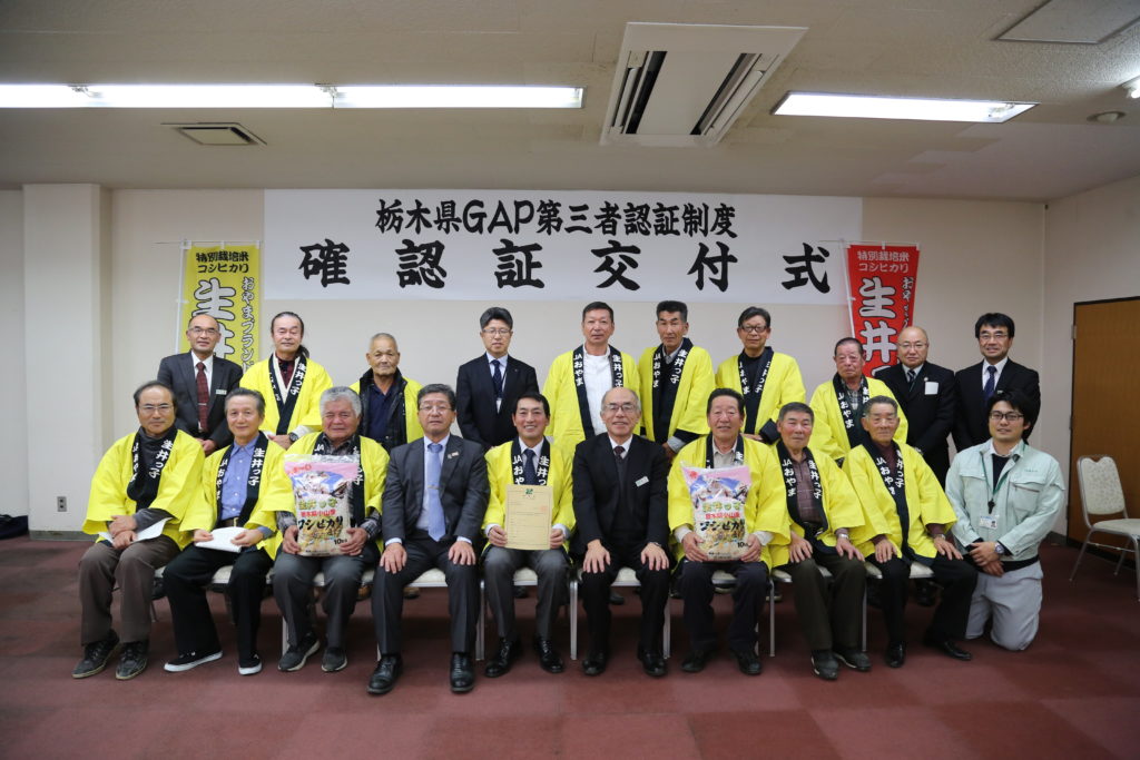 とちぎGAP(農業生産工程管理)の第三者確認証の交付式が昨年12月下旬、JAおやま本店で行われました。JAおやまの生井っ子プロジェクトが県内の米生産団体として初めて確認証が交付されました。