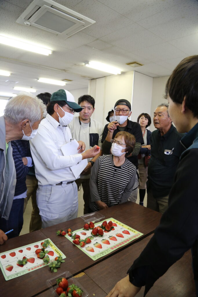 JAおやまいちご部会は11月7日、西部集出荷所で2024年産イチゴ「とちおとめ」「とちあいか」の目ぞろえ会を開きました。部会員、関係者ら77人が参加し、販売情勢や出荷要領、規格を確認しました。