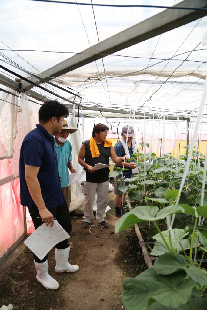 JAおやま北部きゅうり部会は8月21日、小山市と下野市の園地2ヵ所で抑制キュウリの現地検討会を開きました。生産者、栃木県下都賀農業振興事務所の関係者ら約15人が参加し、病害虫防除や管理のポイントを確認しました。