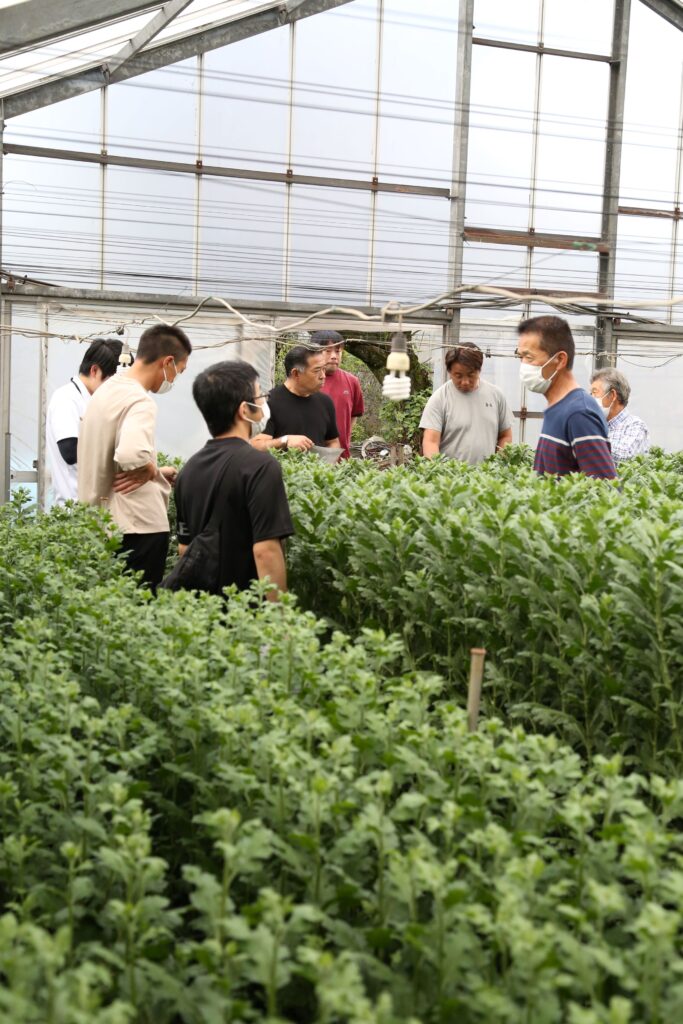 小山花卉(かき)園芸組合キク部会は10月5日、小山市、下野市、栃木市の4カ所で現地検討会を開きました。生産者、関係者ら8人が参加。各ハウスを回り、菊の生育状況や栽培管理、出荷時期などを確認しました。